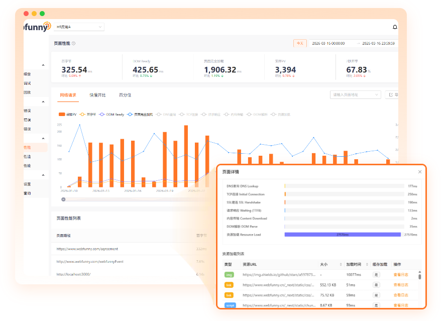 Webfunny专注于前端监控系统,前端埋点系统的研发。 致力于帮助开发者快速定位问题,帮助企业用数据驱动业务,实现业务数据的快速增长。支持H5/Web/PC前端、微信小程序、支付宝小程序、UniApp和Taro等跨平台框架。实时监控前端网页、前端数据分析、错误统计分析监控和BUG预警,第一时间报警,快速修复BUG!支持私有化部署,Docker容器化部署,可支持千万级PV的日活量!