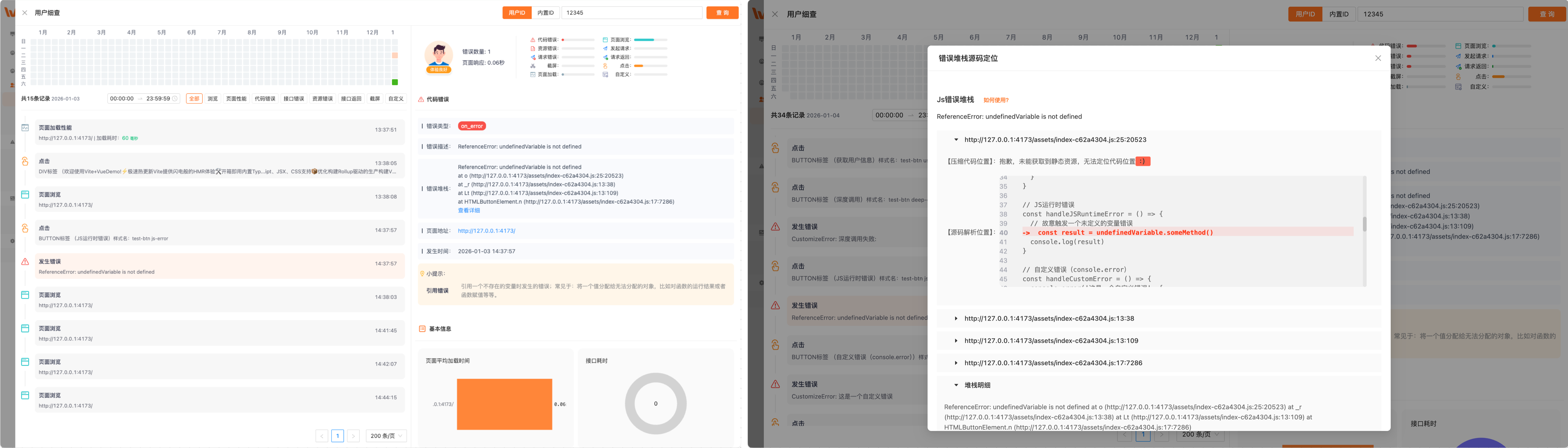 在用户细查中,快捷定位错误代码位置。