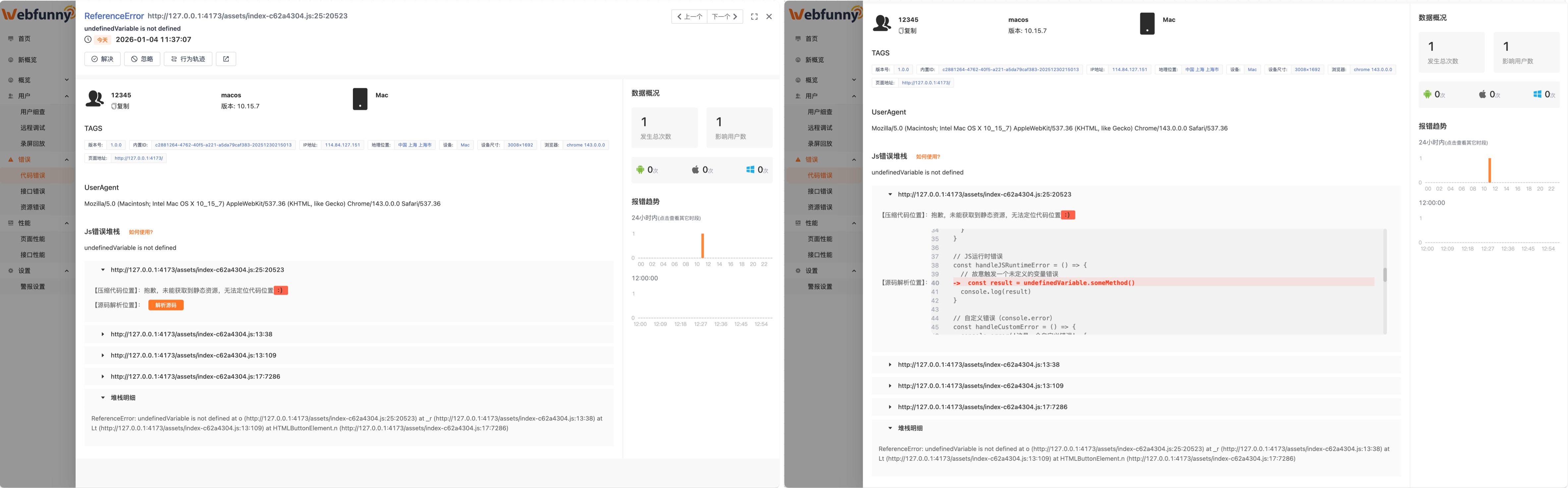 传统的sourceMap解析方案,最重要的一个问题是,需要人去关注map文件的上传和存放;而自动化的解析方案,则是非常的便捷,虽然需要额外启动一个服务和数据库,只需要做好配置就可以自动解析了,省时省力,当然,这些在webfunny里边都已经做好了,无需用户再操心了。