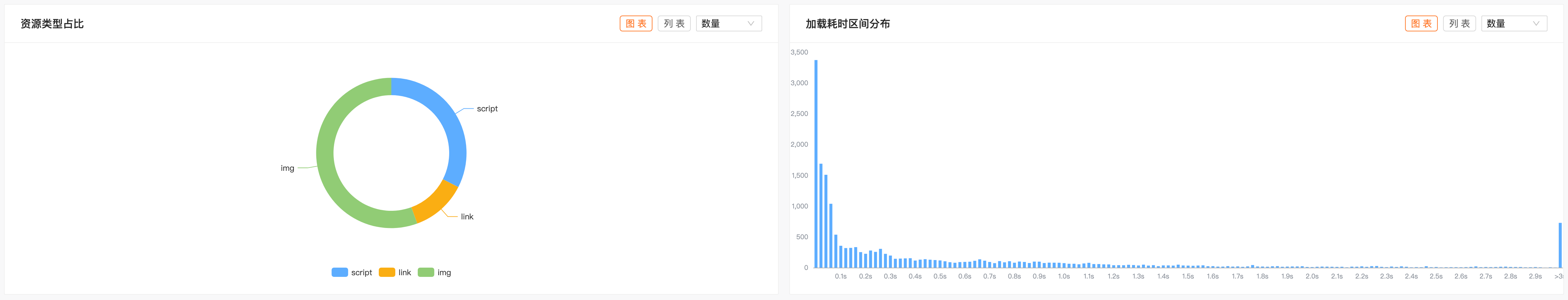 这里有两个维度的分布至关重要:「资源类型占比」它直观地展示了 script、link、img等各类资源在总请求数或总流量中的比例。如果图片资源占比异常高,治理方向自然指向图片优化。「耗时区间分布」这是一个柱状图,展示了多少资源是在 0-200ms 加载完成的,又有多少资源耗时超过了 2s。